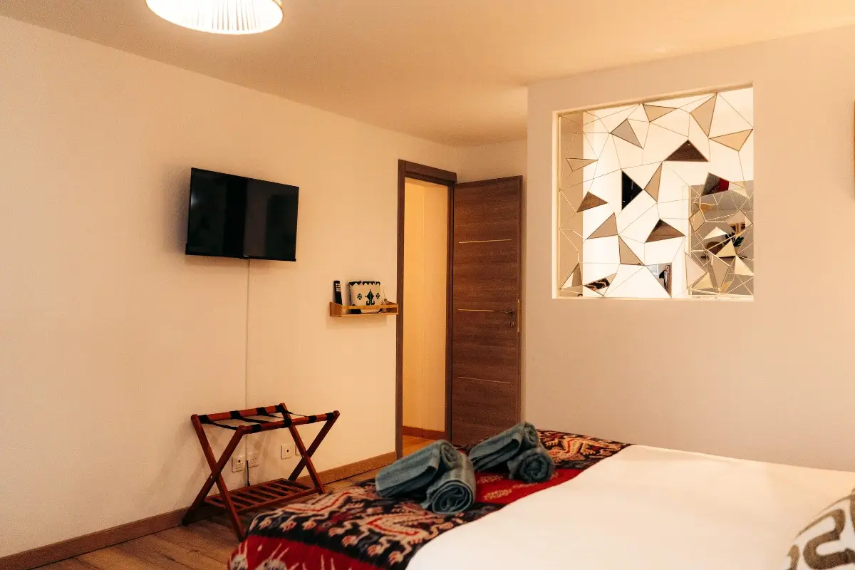 Une chambre intimiste aux teintes terracotta, signe de convivialité et de chaleur, idéale pour un séjour romantique en duo.
