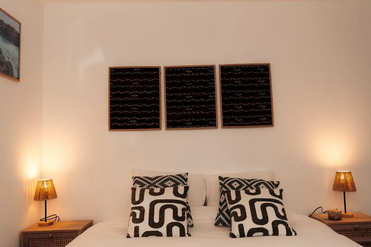 C’est à Santorin que nous avons été marqués par ces poutres en bois patiné qui traversent les plafonds bas des maisons anciennes. Cette architecture simple mais puissante, où chaque élément a sa fonction et sa beauté brute, nous a inspirés pour aménager cette chambre. Nous voulions recréer ici cette sensation si particulière : l’impression d’entrer dans un refuge chaleureux, tamisé, où le temps ralentit.